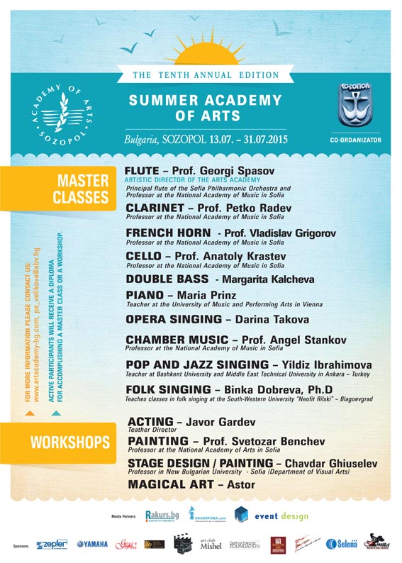За поредна година Лятна Академия на изкуствата – Созопол събира талантливи млади хора от средните и висшите учебни заведения по изкуствата от страната и чужбина без възрастови ограничения, които искат да развиват и усъвършенстват своя талант пред погледа на преподаватели с утвърдени световни имена. От 13 до 31 юли 2015 г. участници от България, Франция, Гърция, Германия, Бразилия, Турция, и други ще посетят майсторски класове и уъркшопове по класически музикални инструменти , живопис, актьорско майсторство, сценография и магично изкуство.