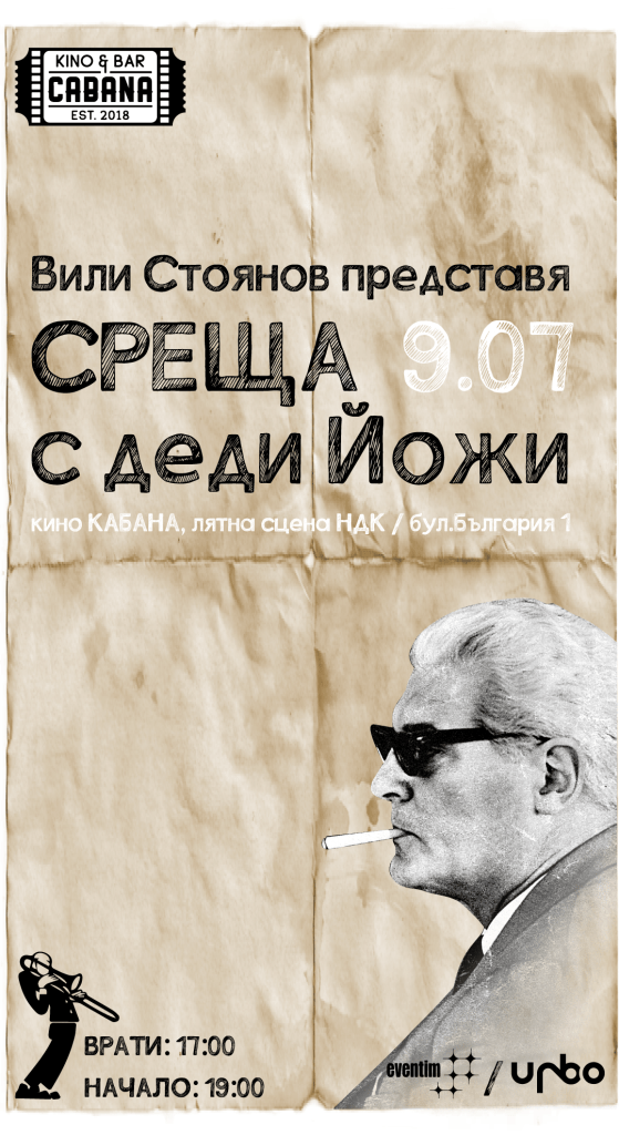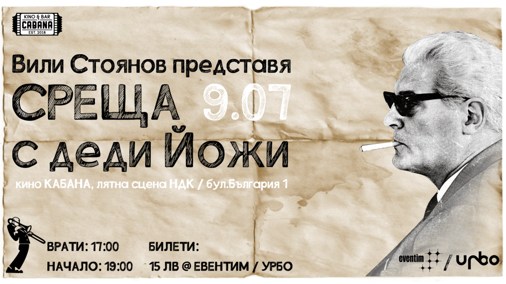 Странните времена, в които живеем отложиха премиерното представяне на програмата, което неуморният тромбонист Вили Стоянов готвеше за пролетта, но благодарение на домакинството, от страна на дирекция Култура, към Столична Община „Среща с деди Йожи” ще има, в лятното кино на НДК (кино Кабана), на 9 юли.
