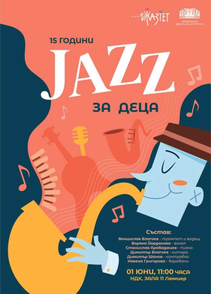 На 1 юни (неделя) от 11:00 ч. в Кино „Люмиер“ проектът „Джаз за деца” ще отпразнува своя 15 годишен рожден ден с концерт. Проектът, който събира с музика, импровизации и добро настроение малки и големи в цялата страна, кани своите почитатели да послушат, да посвирят или да потанцуват дори. От своето създаване през 2010 година с традиционните си концерти в „Чайната”, проектът завладява сърцата с любими пиеси, разнообразни перкусии, духови инструменти и много забава!