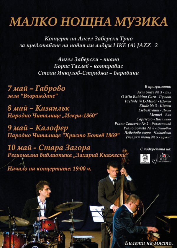 „Малко нощна музика“ – така озаглавиха своето музикално пътешествие музикантите от Ангел Заберски Трио, за да представят своя трети авторски албум “Like Jazz” Volume 2. Препратката към една от най – романтичните класически пиеси не е случайна, тъй като музиката, която ще представят е селекция от най – популярните и същевремнно романтични класически теми от Бах,... Continue Reading →